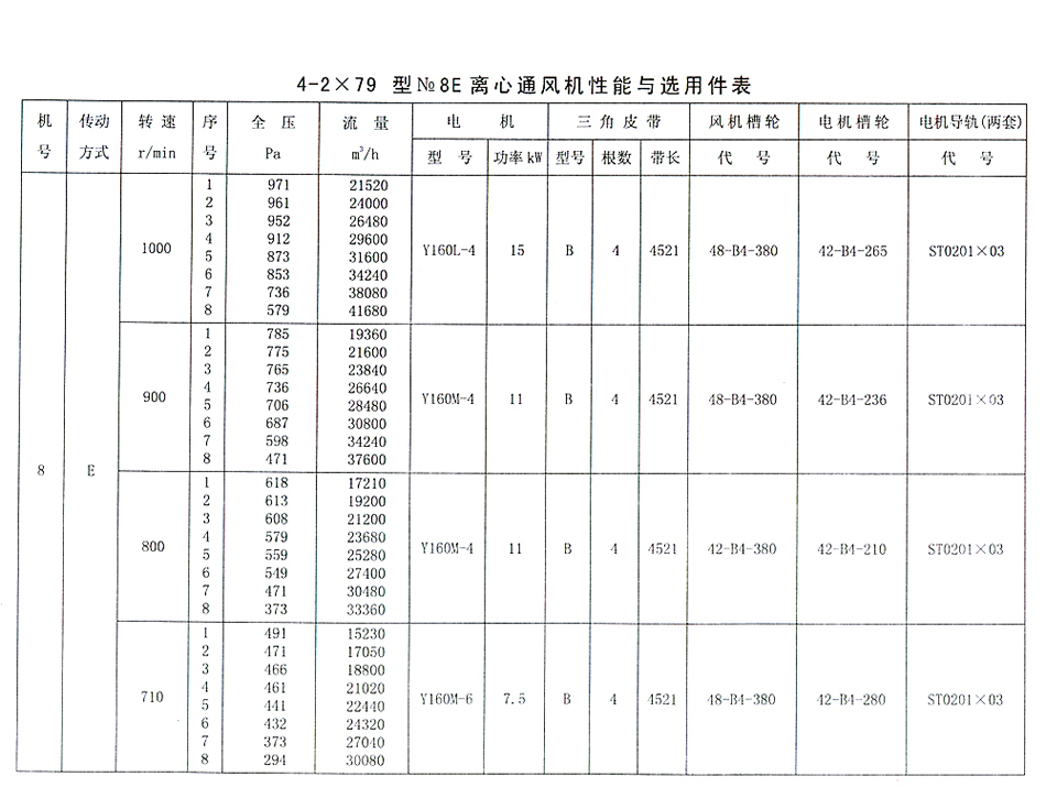 2、風機的出口位置,以機殼的出口角度表示。4-79型風機No3A~6A在出廠時均做成一種型式,使用單位根據要求再安裝成所需要的位置,出風口位置調整范圍0度~225度,間隔是45℃;No7C~8C出風口位置調整范圍0度~180度,間隔22.5度;No10E~20E單進風和雙進風出風口位置均制成固定大三種:0度、90度、180度,不能調整。如果您需要特殊機號、特殊出風口角度等非標準型號,我公司可為您設計和制造,但訂貨時需詳細注明。