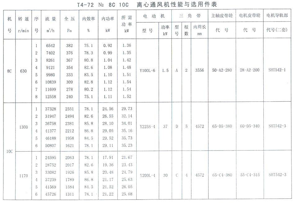T4-72 No 8C、10C離心通風(fēng)機(jī)性能與選用件表